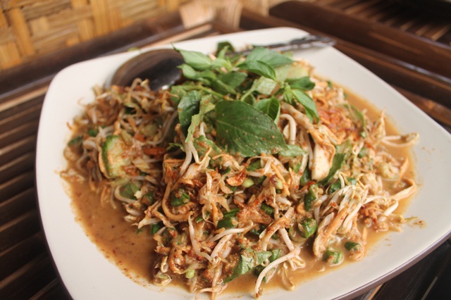I arrived at BIOTROP a few days after the courses commenced. I was just in time for lunch and one of the buffet dishes was piled high with karedok, my favourite Sundanese salad. A hearty paste of powdered peanuts, ginger, galangal, garlic, terasi, palm sugar, salt, a bird’s eye chilli and a smidge of water is mashed together with a pestle in a wide, shallow mortar. Then in go crunchy snake beans, bean sprouts, cabbage, cucumber, baby eggplant and lemon basil leaves. All but the latter is sliced aerially which always impresses the hell out of me. Served with a sprinkling of fried shallots it’s a delicious staple in my diet of which I never tire – though I’ve only found one karedok lady (and it always seems to be a woman wielding the pestle) who makes it cukup pedas, spicy enough for me. Sangat pedas! Pedas sekali! Pedas banget! Pedas pedas pedasI I always insist. The BIOTROP kitchen’s karedok tasted quite different to Bandung’s; it was much milder, too light on the terasi perhaps and contained shredded carrot. But then again it’s always slightly different. “Beda tangan beda rasa,” replied my colleague Dian sagely when I remarked on this. I smiled. “Tentu saja! Of course. Different hands, different flavour.” My favourite language lessons occur over food.