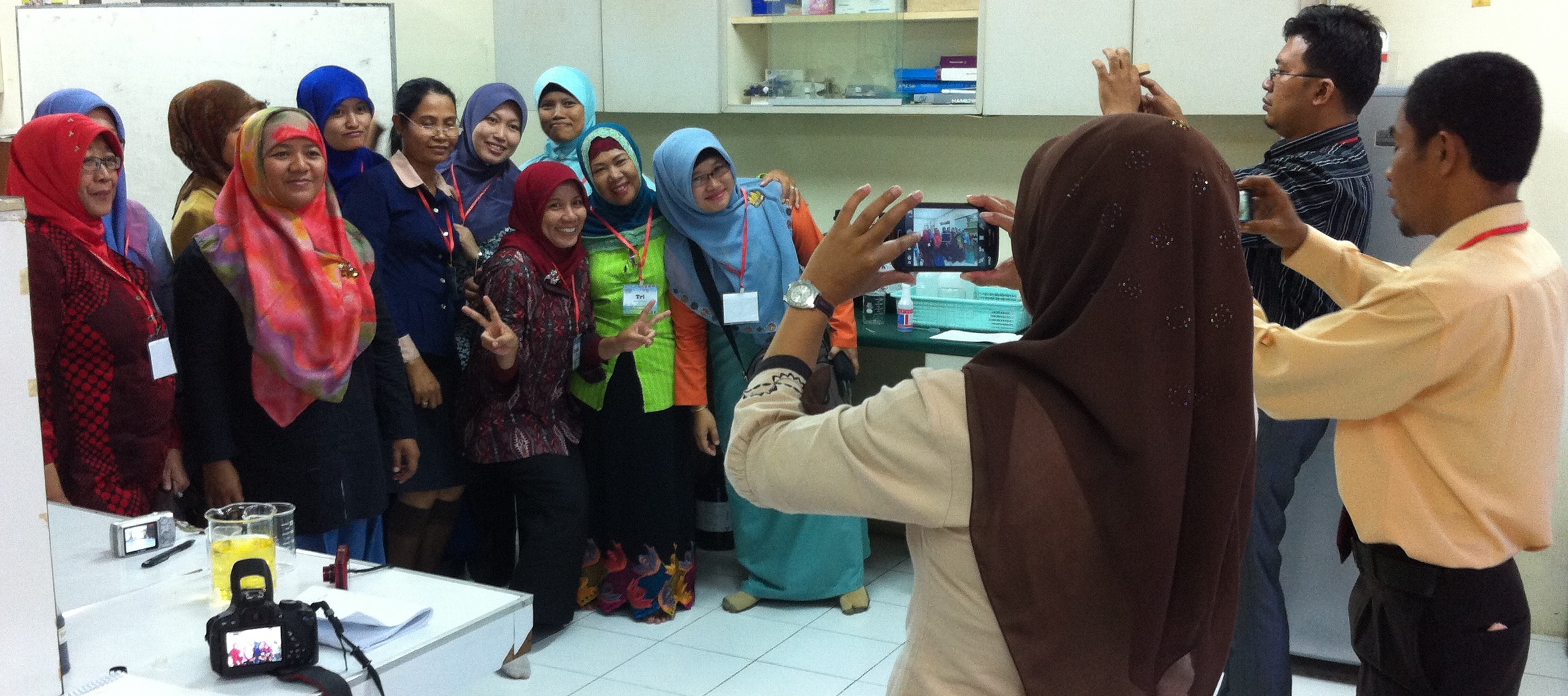 For the next week I was to assist with the Science Education for Sustainable Development course but that afternoon’s Earth and Space Science sessions were on volcanoes and earthquakes – I wasn’t gonna miss the mantle-plumes, magma domes, flux melting and tectonic plate movement! (Apparently in 50 million years Java will join with Australia! That’s a nice thought). At the end of the session I lined up to thank the lecturer and ask a couple questions but was accosted by an Ibu with a camera. A serried group of guru were standing in front of the SEAMEO member country’s flags. She grabbed my arm and pulled me close, her hand clutching my shoulder. I hadn’t met these teachers but after the white girl was in that shot it was free for all. “What is your name?” the arm-grabbing Ibu in emerald jilbab asked me after four or five snaps. “Saya Julia.” “Miss Julia? May I have a photo?” I heard at least 15 times over the next half hour as I smiled cheesily for multiple cameras with almost every course participant. Finally I managed to flee, consoling myself with the fact that now they’d got it out of their system their burning desire for foto sama bule would dwindle. And, like on countless occasions when I’ve made assumptions about Indonesians, I couldn’t have been more wrong.