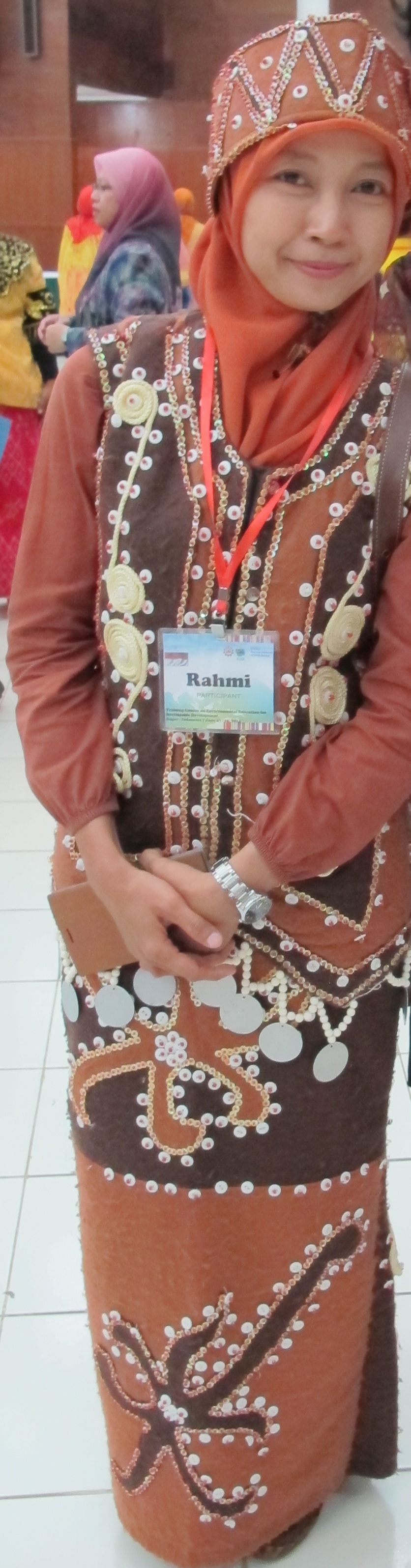 The ‘Traditional Heritages Sharing Afternoon’ closed the course program. The cavernous hall was a kaleidoscope of sartorial splendour: flamingo pink Thai and sparkling silver Laos silk, electric blue and yellow Vietnamese áo dài, artichoke green Khmer sampot, gold-encrusted Phillipino barong tagalog, a rainbow of silk kebaya and naturally a stunning array of batik kain and sarong. The motifs, colours and patterns are infinite. My favourite costume was the camel and white felt dress adorned with big silver coins of a petite woman I called the Dayak Princess. The astonishing assortment of Indonesian dress just among this group was testament to the nation’s cultural diversity. My Dayak Princess looked as though she was from a completely different country to the big, buxom Ibus from Java whom, on this final night of the course sure as hell did not hold back. They’d grab my arms or waist and wrench me into frames or wobble over as quickly as their shapely hip-hugging kain would allow to converge on a group shot I’d been dragged into. They were relentless, these women, but I had to admire their completely shameless love of posing. After all, all dolled up in their cleavage-accentuating kebaya and beautiful batik they were magnificent. I wondered with a warm heart if I’d ever attend a work event this colourful again, but was relieved when it was time for maghrib, the evening prayer. I strolled slowly out of the hall with my colleagues and when out of earshot of the Ibus I joked about just how much we could’ve made. “Sepuluh ribu! Foto sama bule!” we bellowed together.
