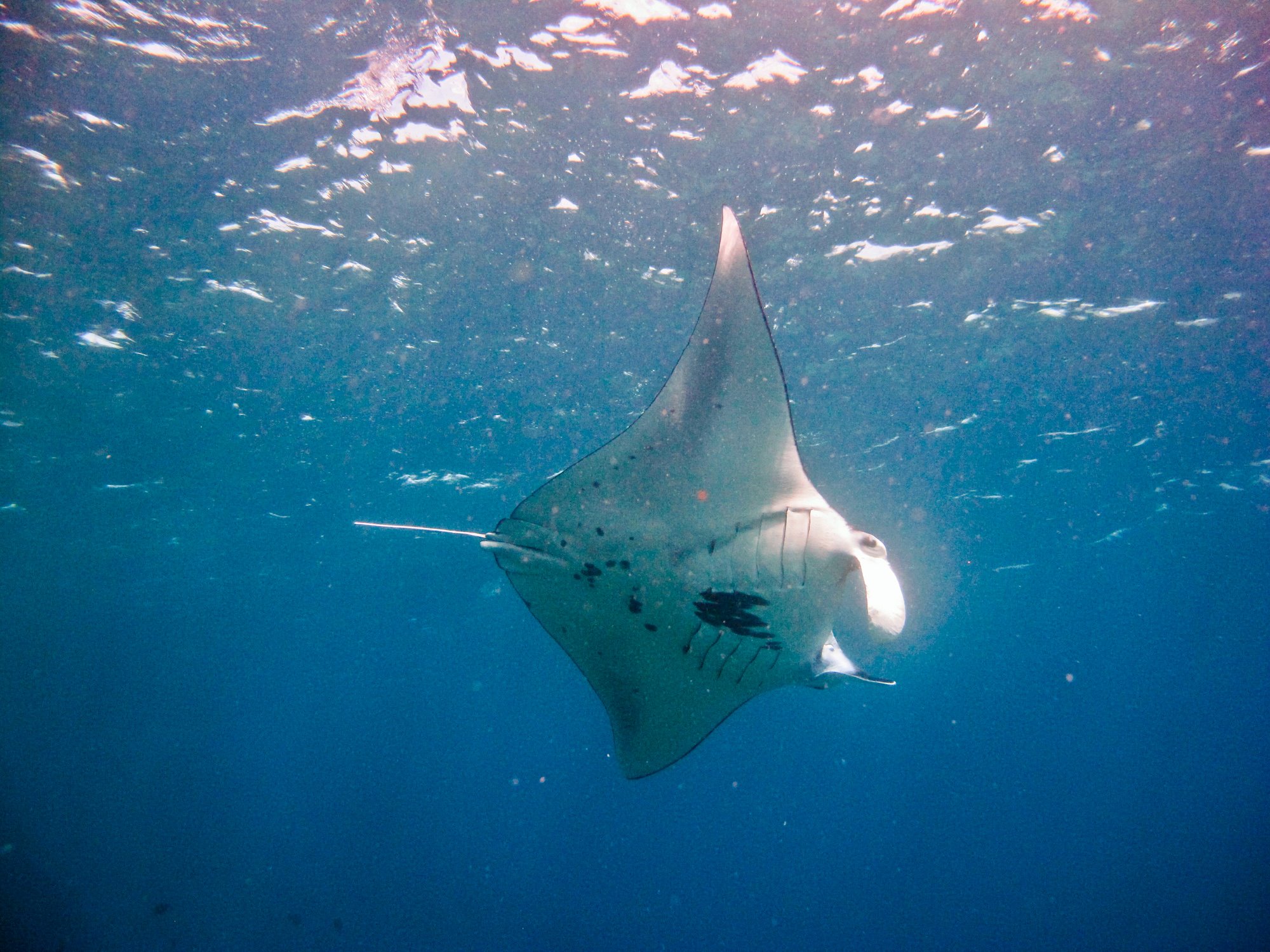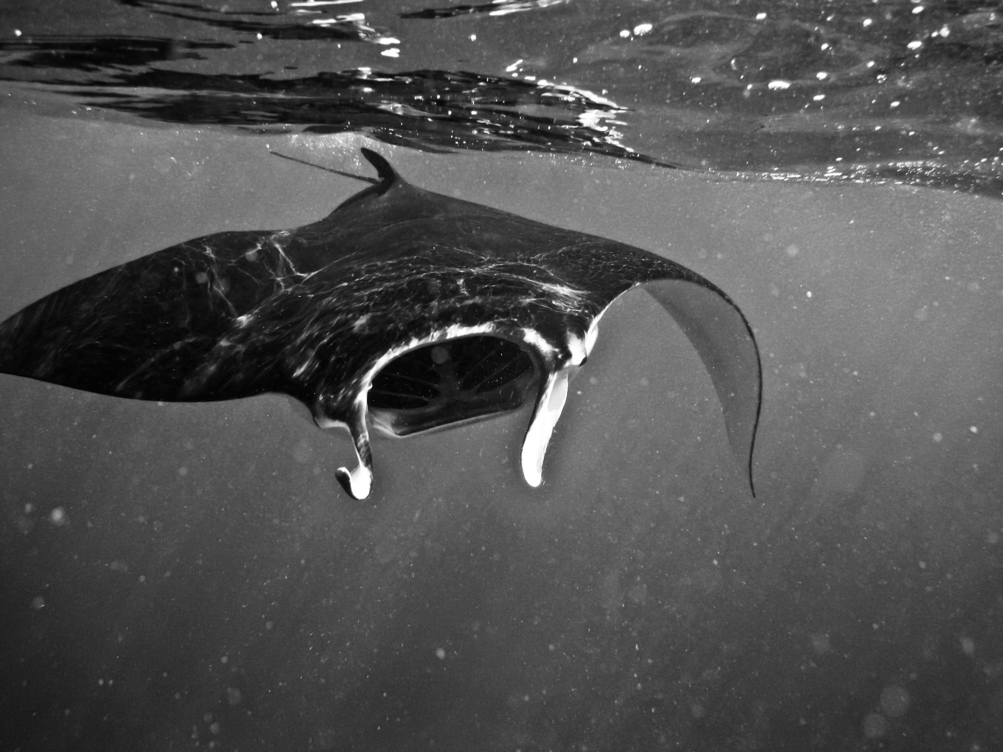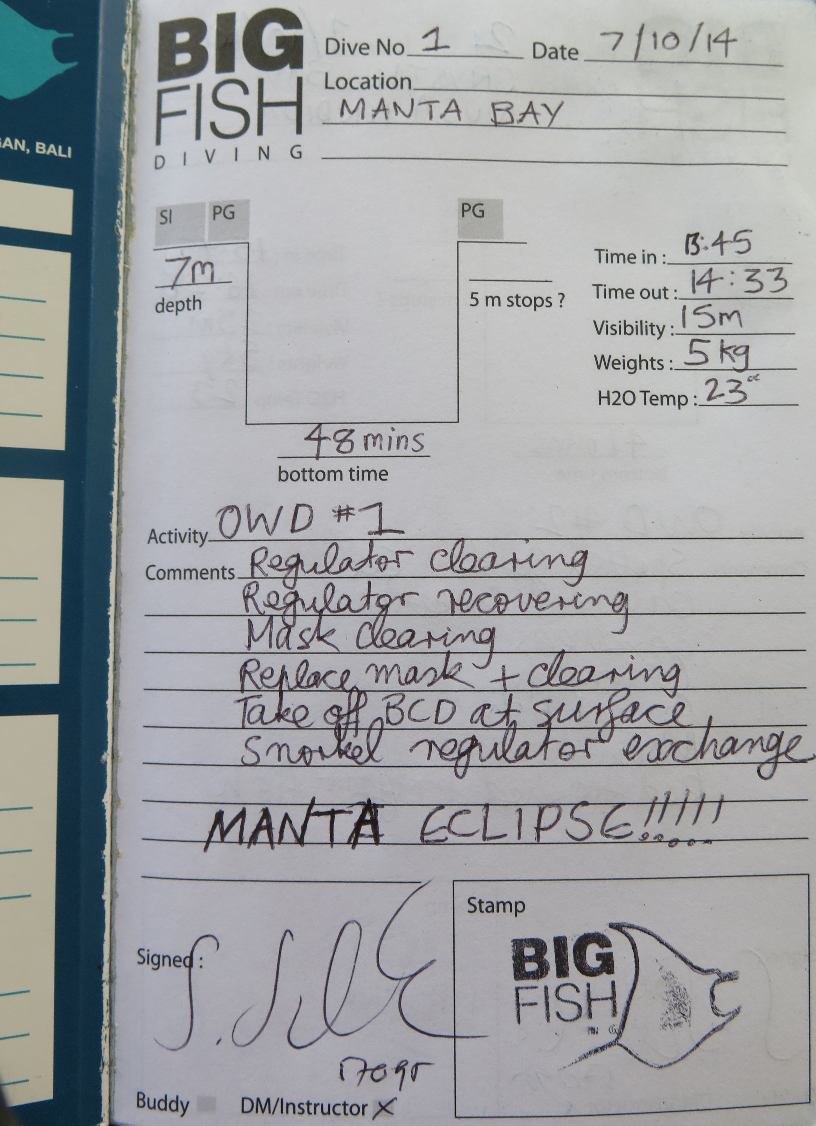 8500In 2000 my ocean girl dreams came true. On a one-day cruise in the Great Barrier Reef with Dad and my brother Hugh I dived at Michaelmas Cay. It was, in my 12-year-old’s words, the best thing I’ve done in my life. 14 years later I completed my Open Water Diver certification with Big Fish Diving, based on the small island of Nusa Lembongan off Bali’s southeast coast. The magical memory of Nicky swimming through my legs made me smile even wider when a large pod of dolphins was spotted as we approached Manta Bay, my first dive site. Ten minutes in a manta sailed right over me. I rolled onto my back and my eyes bulged into my mask as it blocked out the sun. Manta Eclipse.