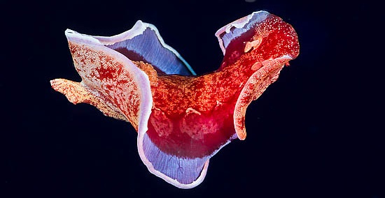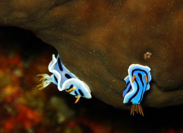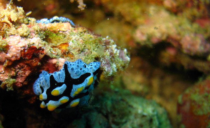 After four instructional dives with Stef and two other students I was ready to dive with Chriswan as my buddy. He’s a Dive Master with over 700 dives under his weight belt. Stef remarked how fortunate I was to have Chriswan as my buddy, as he’s not only completely competent but “has the eyes as well”. As he drifted effortlessly he pointed out tiny creatures to me – a translucent anemone crab, a long whiskered banded coral shrimp and my all-time faves, nudibranchs! I’ve long been enchanted by their spectacular colours and stunning shapes. I once went to a costume party in Canberra dressed as my absolute favourite, the Spanish dancer (Hexabranchus sanguineus).