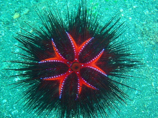 Seconds after I splashed in backwards for my third dive I drifted over a couple of sea urchin that appeared to have a red, blue and white neon light display in their centre. Well, dear readers, didn’t Wiki have some titillating facts about this flamboyant critter! The star urchin’s scientific name is Astropyga radiata. ‘Astropyga’ comes from the Greek ‘astro’ meaning star, while ‘pyga’ means anus. “Hence, it is named because of its star-shaped anus (or more precisely the star-shaped pattern around its anus). “Radiata” comes from Latin and means ‘radiant’, because of its colors and spines.” The radiant star anus urchin was definitely one of my favourite discoveries, as was the walking feather star, or comatulida, an otherworldly creature with long, feathery arms trundling along the seabed. From Wiki: “Most comatulids originally have ten arms […]. The arms are fragile, and if one is broken off, at least two grow in its place; in this way the number of arms can increase.”