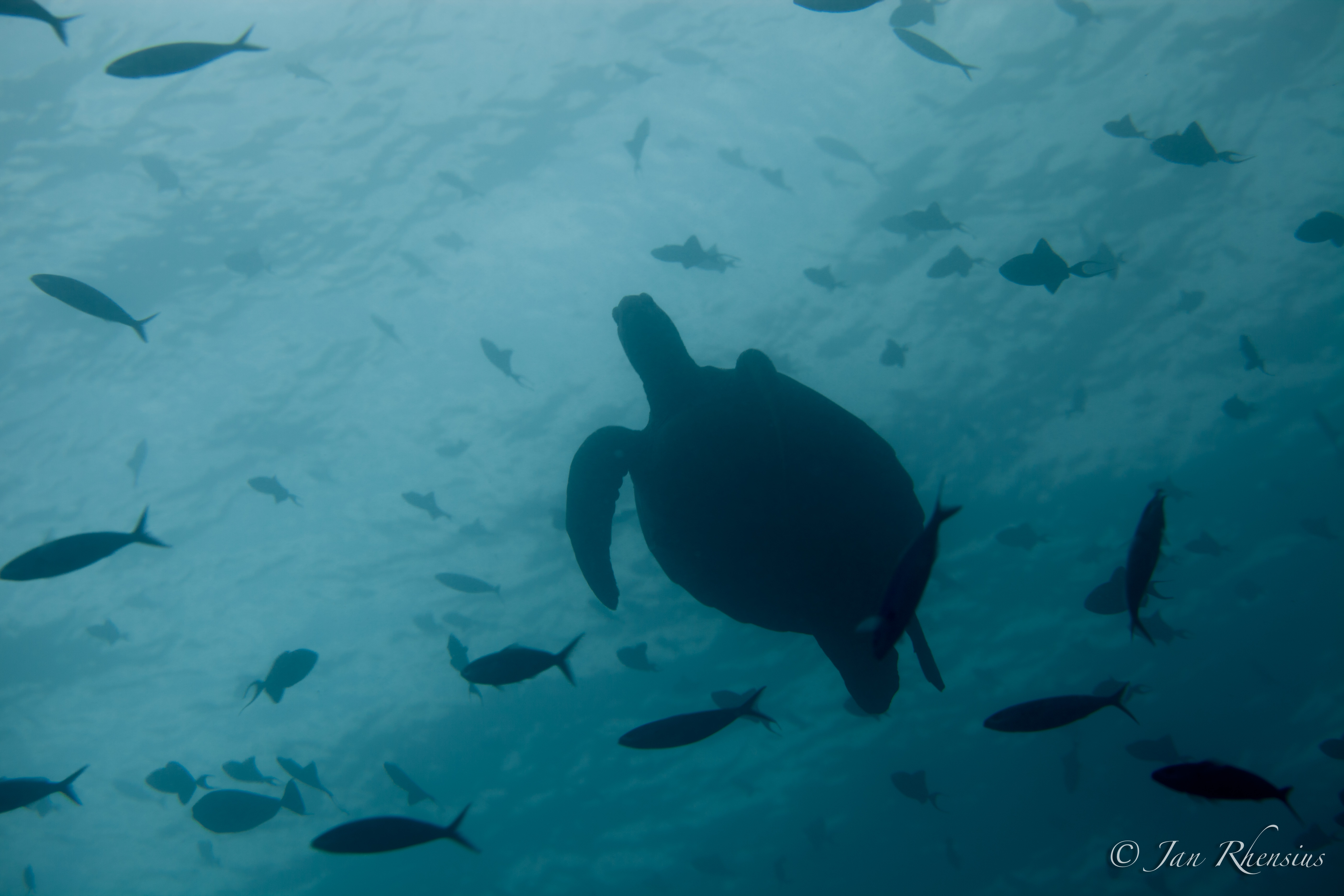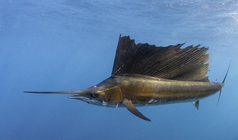 We frantically grabbed our snorkel gear and splashed in desperately hoping for an underwater glimpse, but as dolphins normally do they scattered instantly. What we saw then scared the hell out of us: a three metre sailfish, tall black jagged sail fully unfurled and long silver sword pointing straight at Ruby! She immediately put her fins up in defense. I thought she was going to become Ruby satay! We must have jumped in directly in front of it. Startled, it swam left then right for a few seconds then in a silver flash disappeared into the blue. With racing hearts we trod water for a few minutes, completely flabbergasted at what we’d just seen.