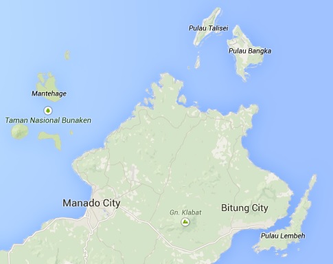 After Lembeh Chriswan jetted off to Jakarta for a week of meetings while I took the public boat from Manado to the small boomerang-shaped island of Bunaken, on the northern tip of the top right arm of Sulawesi. The wooden boat was stacked with masses of market produce, gallons of drinking water and cooking oil, boxes of Bintang. A scooter was carried aboard and secured with rope. Above the swollen baskets of spring onions and giant hands of bananas, bulging bags of KFC were hung from hooks on the ceiling. I was thankful the durian was stashed in a cupboard. There were mostly women on board returning from their market run, chatting loudly above the twin outboard motor thrum. I spoke with a charming ibu named Mariana who lives in Kampung Kristen. On Bunaken Christians and Muslims reside in separate villages though there’s no enmity between them; the separation is simply convenient and means the wiry black long-snouted pigs snuffling around Kampung Kristen won’t roam into any Islamic homes.
