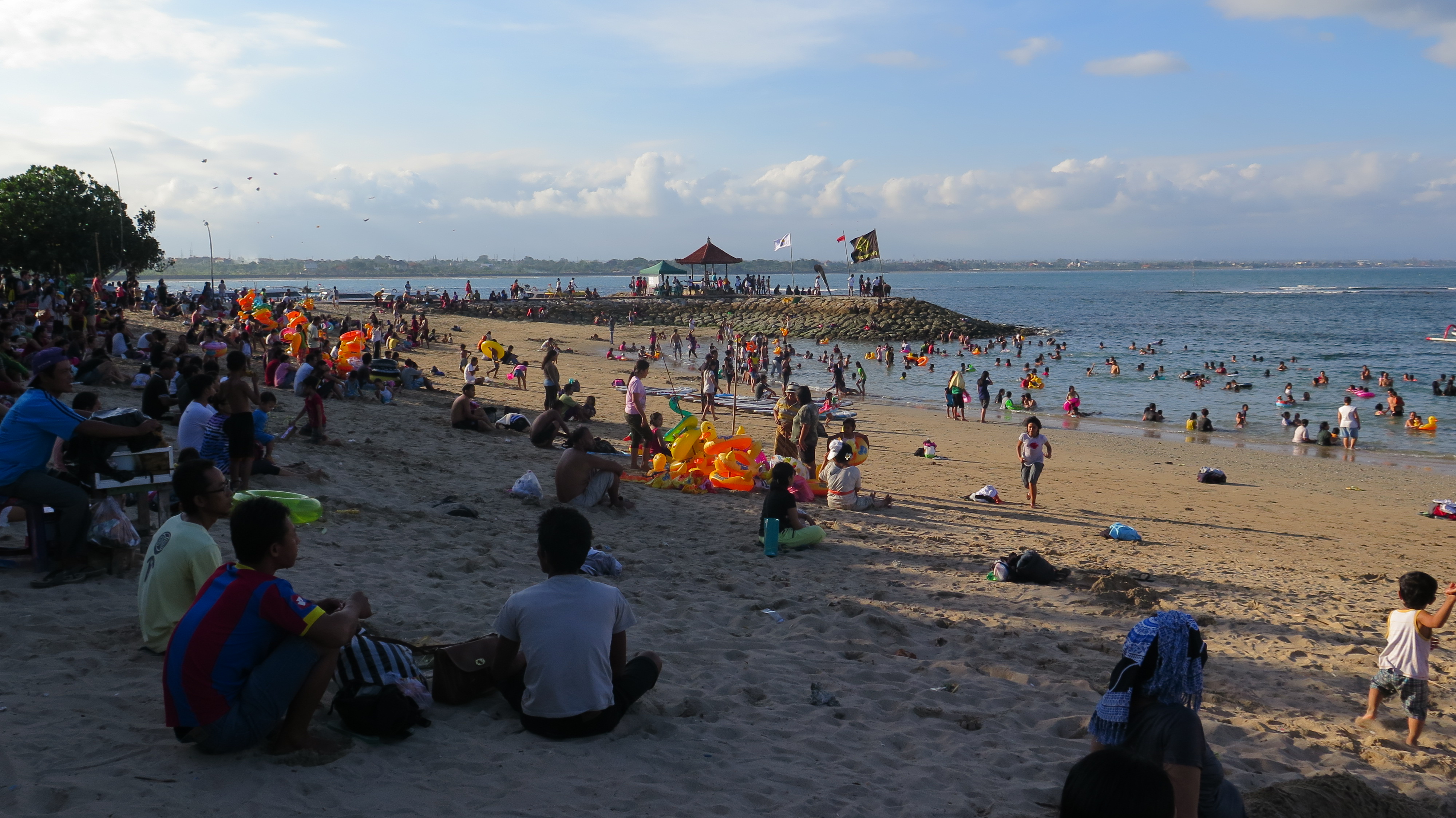 A paved path – the first beachfront walk in Bali – stretches across the sand from Pantai Sanur to Pantai Mertasari seven kilometres south. I worship this path. I doubt there’s another like it in Indonesia. In my experience opportunities to traverse steady terrain for long distances without always being on alert for motorbikes are rare. First the path is fringed with warung and little stalls stacked with the usual seaside paraphernalia – sarongs, sun hats, shells, statues – while women sit on tiny stools on the sand grilling corn cobs on compact racks of coals, flaring the embers with bamboo fans. The jagung bakar is brushed with kecap manis and margarine laced with chili. When you’re fresh out of the water, lips still wet with salt, it is heavenly. Roving lumpia (spring roll) sellers are another indispensable feature (they arrive at sunrise!); lumpia are snipped with scissors into a brown paper cone, smothered in sweet gloopy sauce and served with cabe rawit (potent little green chilies). Enak.