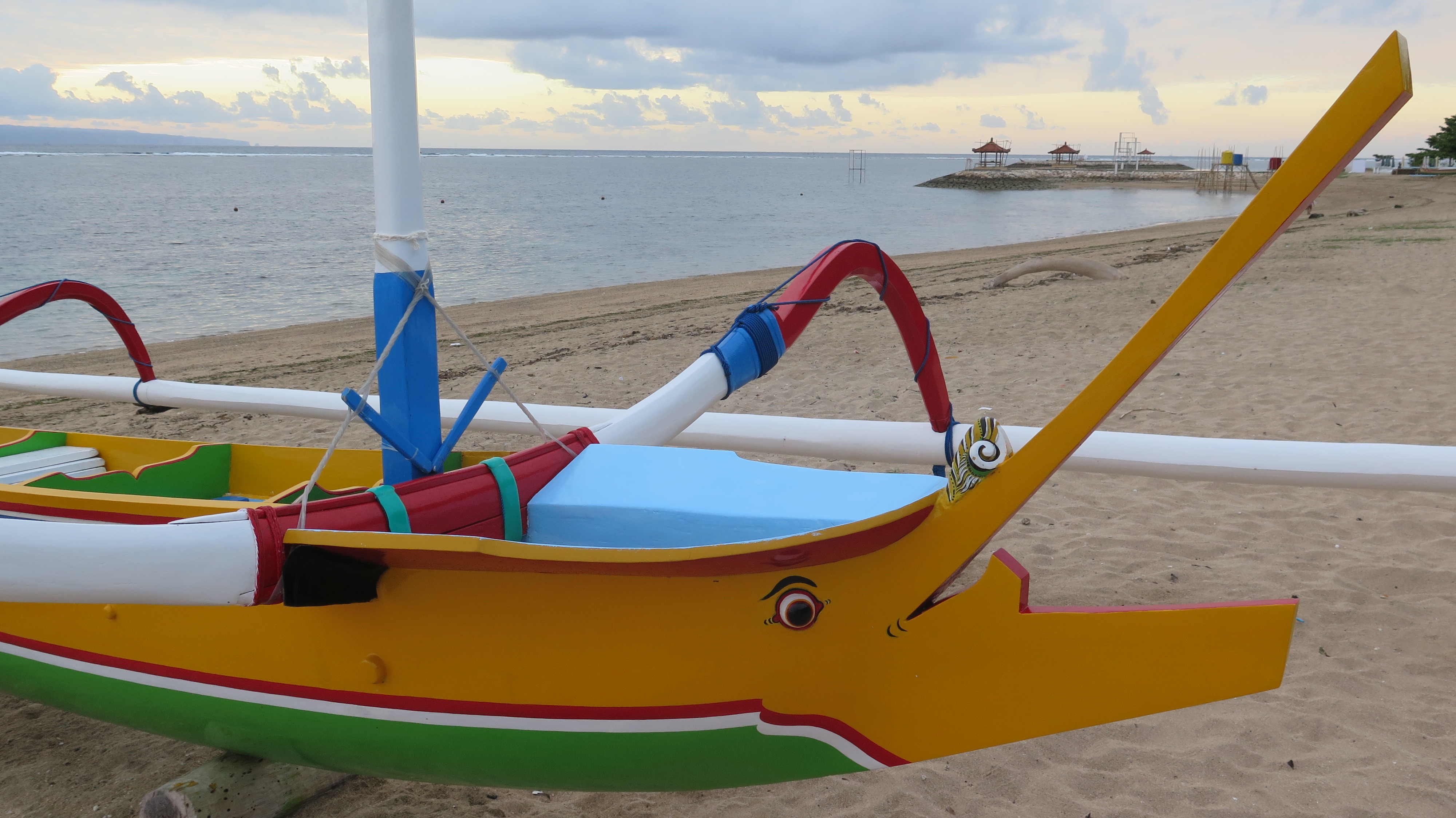 Traditionally the Balinese feared the ocean believing it to be home to dangerous magic, and so they built protective pura (temples) along the coast. The original Sanur settlement was much further inland but fearless fishermen still braved the sinister seas in jukung, small wooden outrigger canoes with a prow like a marlin’s face. They’re still used today and when not out at sea they rest along the path, grinning in cheerful colours like giant children’s toys.