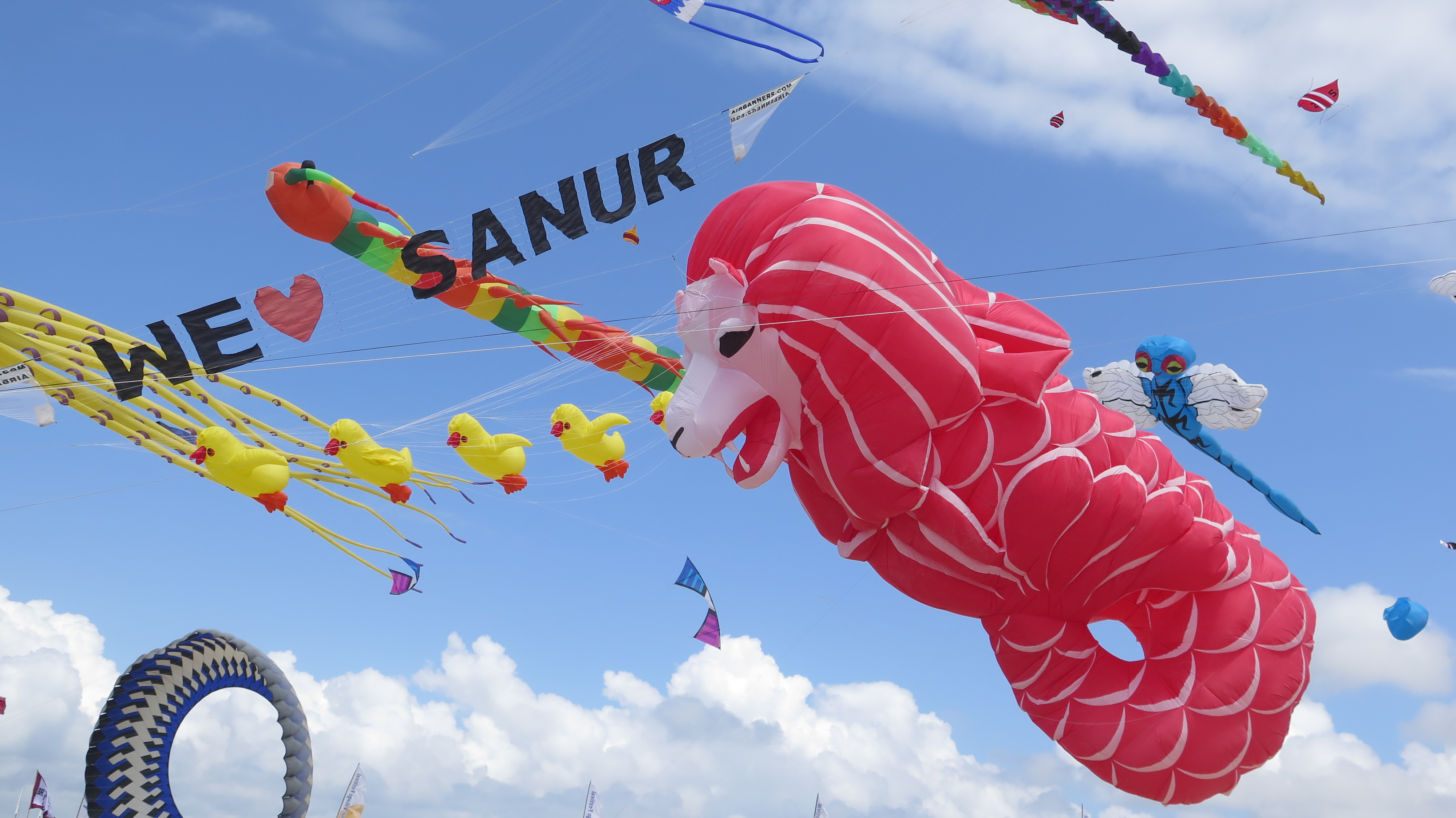 The day before the traditional kite competition Mertasari Beach was a carnival of hyper-coloured creatures: octopus and dragonflies, horses and tigers, a badling of bright yellow rubber duckies and the majestic Singapore Merlion. The wind wasn’t strong enough for a pair of porcupine fish; one only managing semi-inflation while the other blobbed about a few metres off the ground. The crowd of spectators was small, but they were out in full force the following day.
