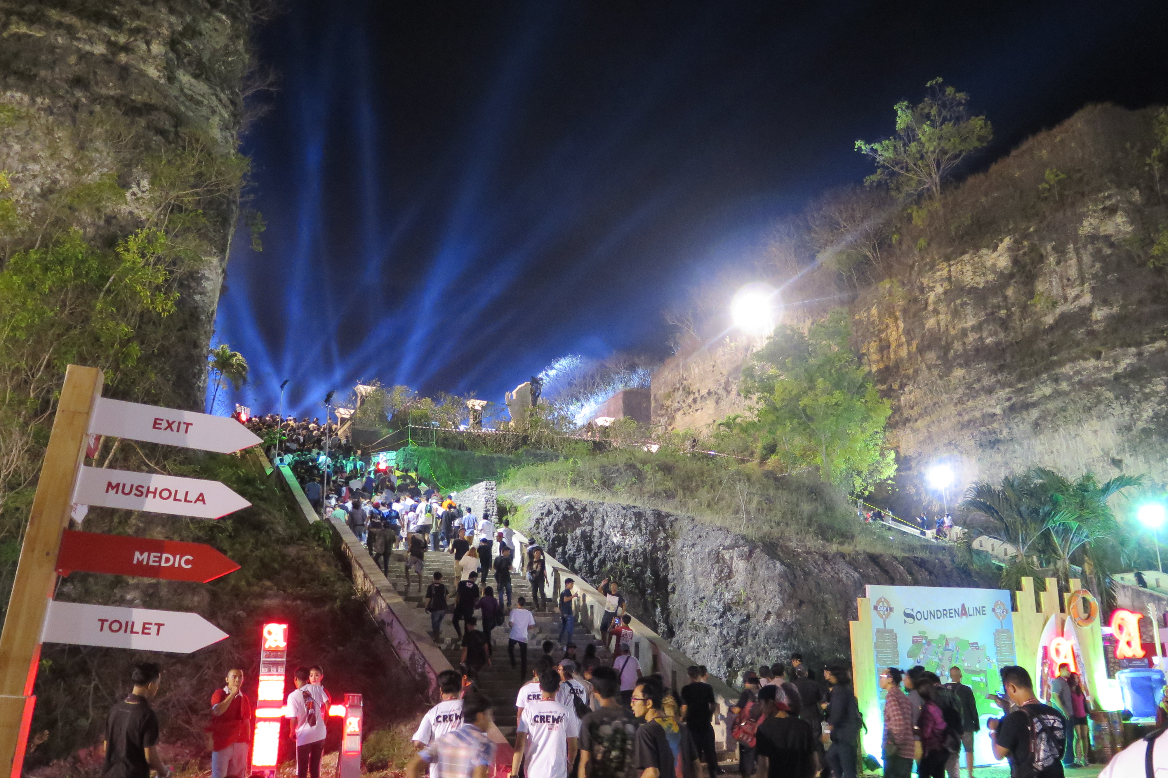 Over 80,000 attended SoundrenAline, but there were no droves of drunk and shirtless howlers, no chance of spew splattering on your shins, no shallow lake of plastic cups and empty tinnies lapping at your toes. Stratocumuli of cigarette smoke absorbed the limestone illuminations as thousands bopped gently beneath, stepping politely out of the way if one needed to pass. Bintang was available, but barely anyone was buying (Beau quipped that if someone was hunting bule all they needed to do was look at the bars).