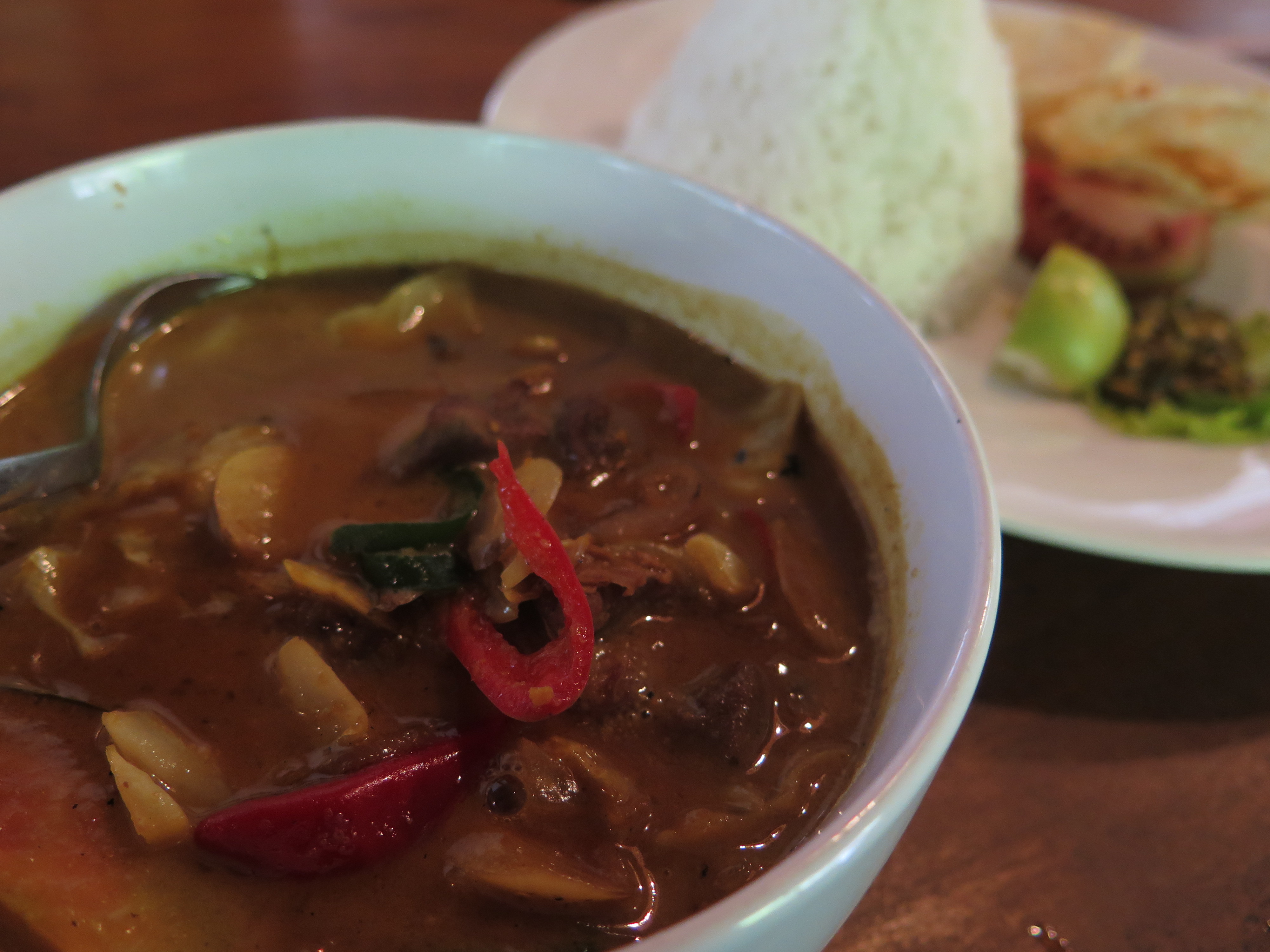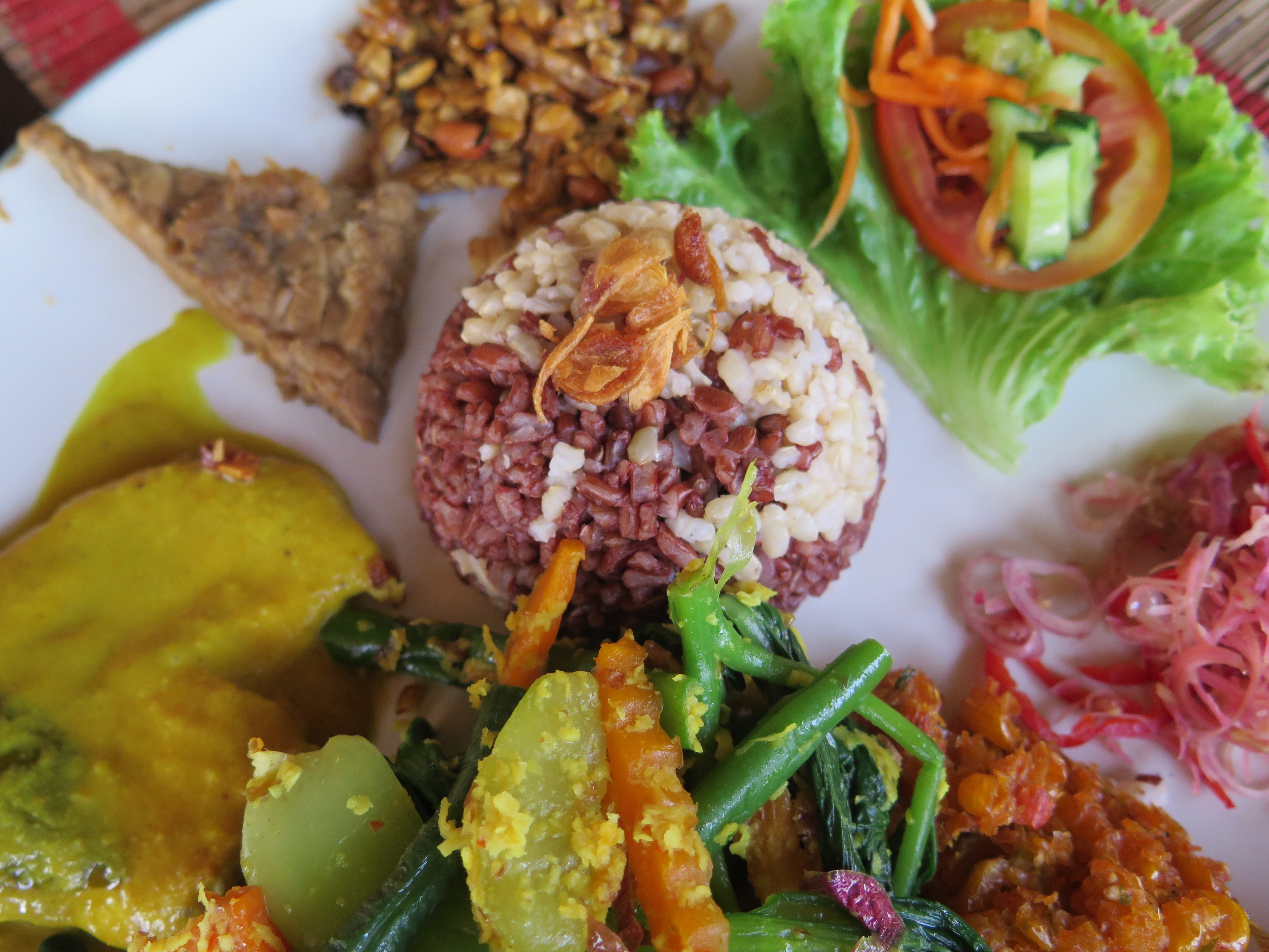 Although nasi campur (rice with various accompaniments) is eaten throughout the archipelago, in my experience it’s only called nasi campur in Bali. In Java it’s nasi rames. As I wrote in Manta Eclipse, I thoroughly relished ploughing through a brown paper parcel of nasi campur on the boat between dives, and particularly loved the serundeng (spiced shredded coconut).
