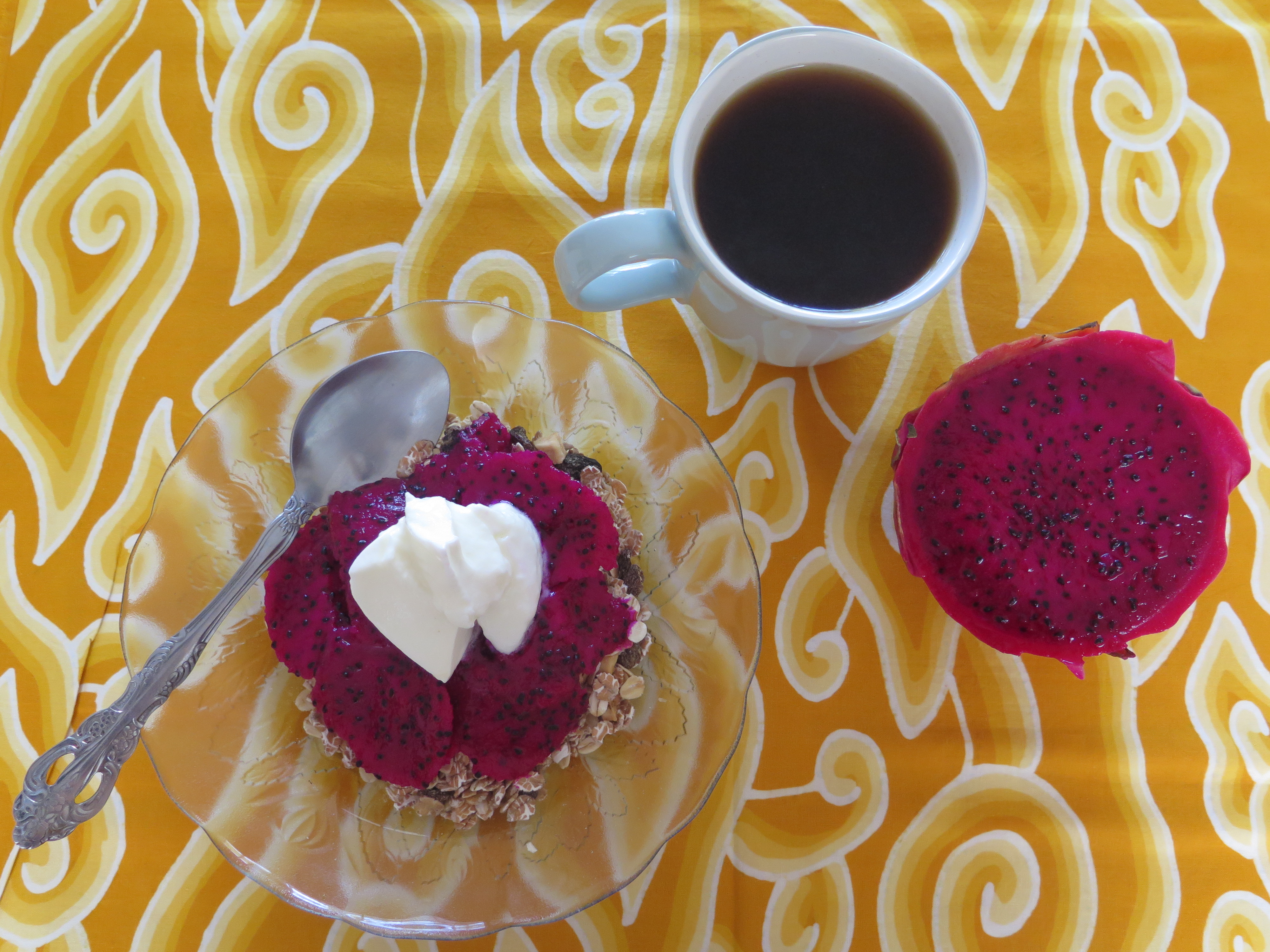 Buah naga merah (red dragon fruit) is in my Top 5 Tropical Fruits alongside mango, mangosteen, sawo and rambutan. Whenever I’m in the fruit section I often find myself hovering over them, ogling their fuchsia skin and outrageous green curls. They’re arguably one of the most awesome looking fruit (I just Googled ‘awesome looking fruit’ and yep, plenty of buah naga merah). Muesli, fruit and yoghurt will never be this psychedelic again!
