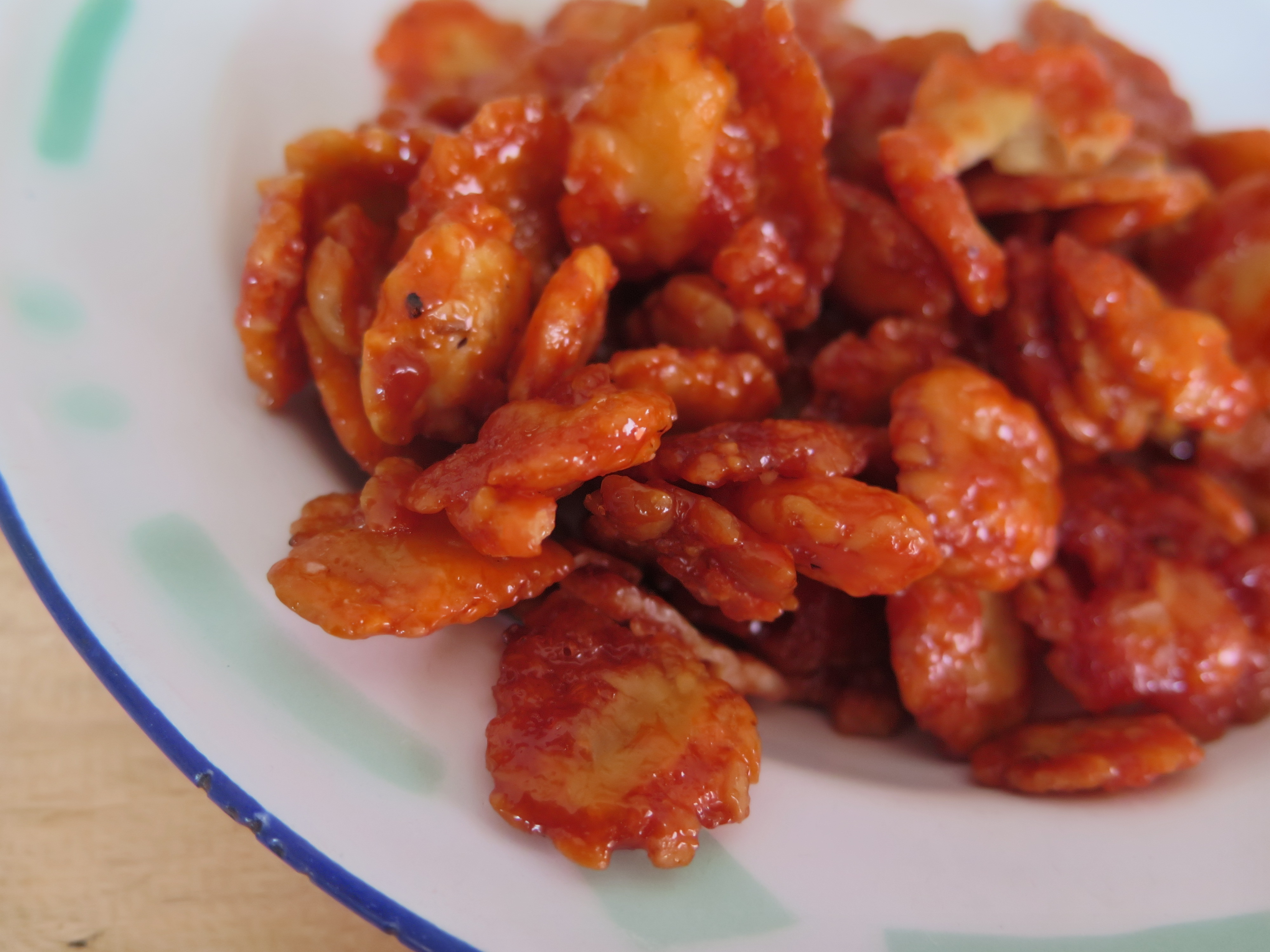 Melinjo have three layers: a thin skin (green when unripe, bright red when ripe and tawny yellow or rusty orange when cooked), an easily removed shell which I think most people discard but I just gnash through, and inside a soft, creamy substance which I assume is the sporangia. It is similar to macadamia but stronger and not as sweet, and has the tiniest bite of bitterness which I find tremendously toothsome. It is this bitter hint that for me makes emping, crackers made from smashed individual melinjo that are sun dried then fried in a sticky mix of chilli and palm sugar, dangerously irresistible. So much so that after I demolished almost an entire bag which Chriswan brought back from Surabaya for me I had to warn him gravely to never buy me emping again. The same rule applies to emping that are simply sun dried sans spicy coating and to kue belinjo, faintly sweet little biscuits made from melinjo flour with a slightly salty crust. Try keeping a big box of those hidden in your desk for longer than a few days. For shame, Julia, for shame.