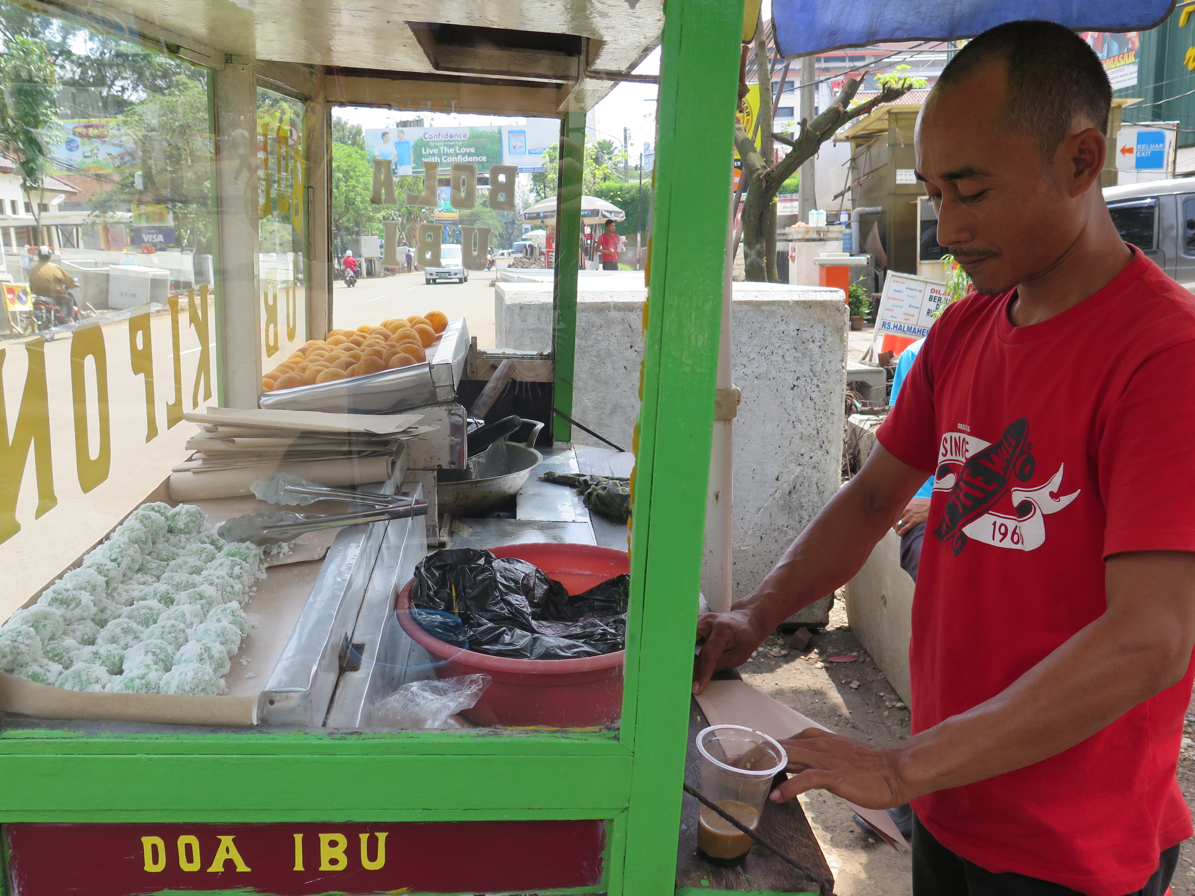 Kaki lima selling es kelapa muda (iced young coconut water) are ubiquitous throughout Indonesia. The first one I had was in Jakarta at a warung opposite the hotel where we were staying for our in-country orientation. I was with three volunteers, two of whom lived in Ubud in Bali so were well acquainted with es kelapa muda’s hydrating super powers. Four giant coconuts on orange plastic plates were placed carefully on the table, each containing about a litre and half of cool coconut water and luscious white flesh. Sarah must’ve seen my eyes bulge at my coconut’s capaciousness. “Don’t worry. Everything can be dibungkus – wrapped up and taken away!” Love this country, I thought. Despite our hearty attempts about half our coconut’s contents remained, so it was expertly extracted in seconds with a special scraping instrument and poured into four little plastic bags for later.