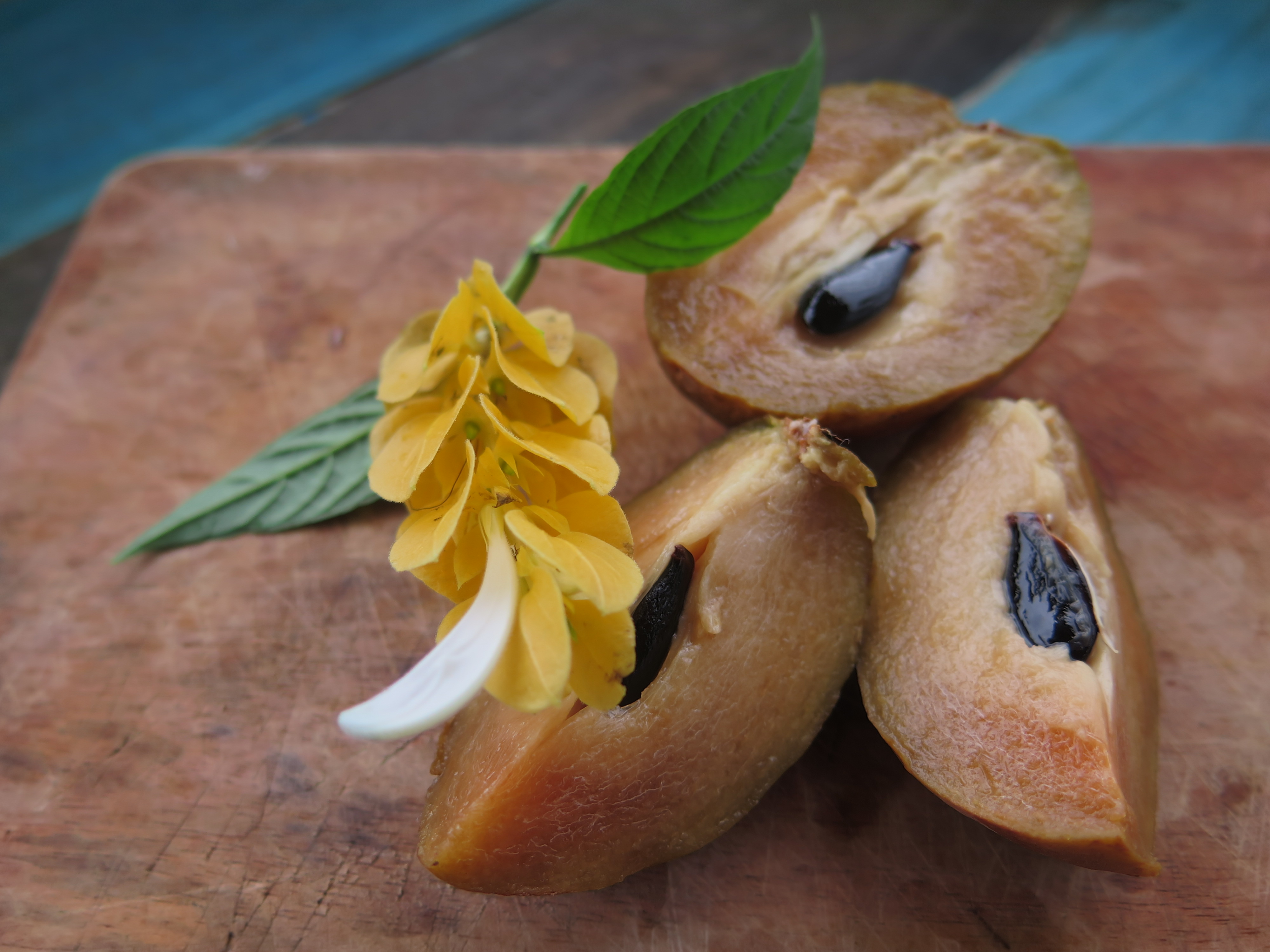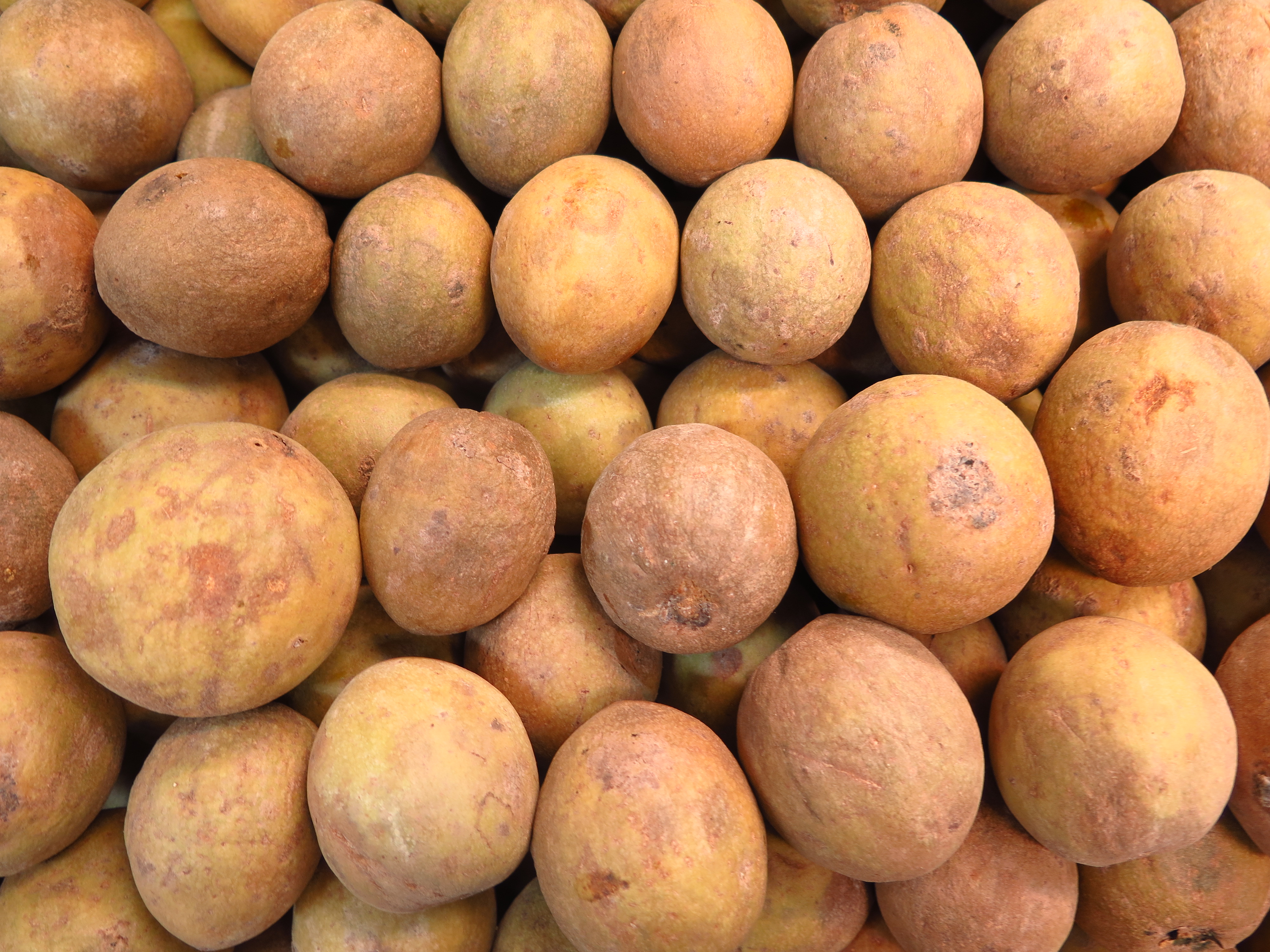 Wandering the fruit and veg section of Super Indo a couple of months after I arrived I spied these unwashed potato lookalikes and, having no idea what they were, I bought some. They were quite firm so I left them to ripen for a few days. When the rough, thin skin shrivelled a little I peeled it to reveal juicy caramel-coloured flesh. Sa-WOAH! It tasted like sweet dates with a texture similar to a perfectly ripe peach, though slightly gritty. The oval separated effortlessly into segments and its few seeds were beautiful, like shiny teardrops of jet.