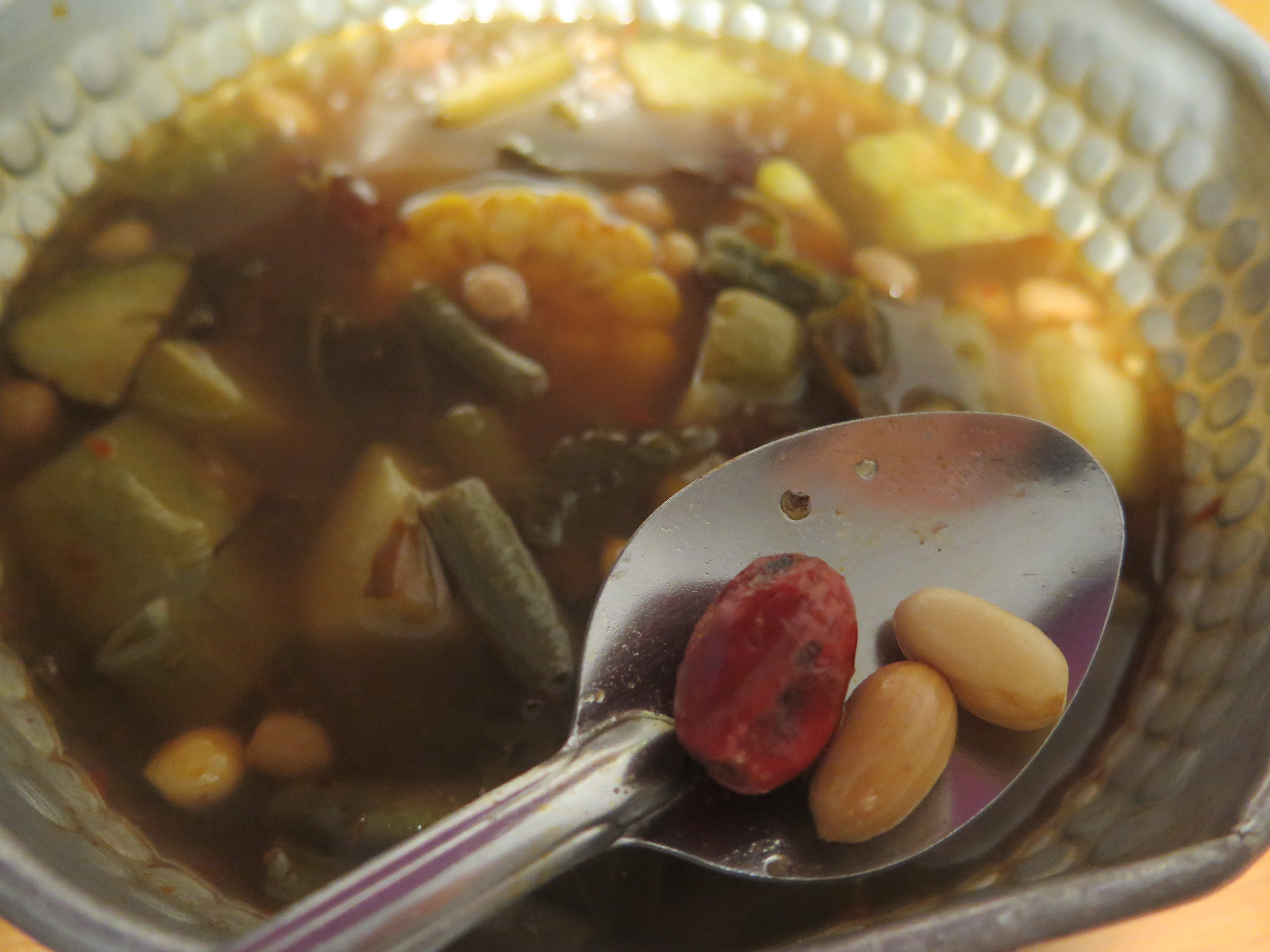 Sayur asem is tamarind soup tempered with kaffir lime, lemongrass and bay leaves and packed with tender veggies; green beans, chunks of waluh (choko), thick rounds of sweet corn, peanuts and melinjo leaves and melinjo strobili. According to Pak Wiki strobili are “[structures] present on many land plant species consisting of sporangia-bearing structures” and “sporangia are enclosures in which spores are formed.” Melinjo are generally considered to be nuts or seeds but I had an inkling the first time I chewed one, slowly navigating the multiple textures and flavours with my tongue, that they were perhaps a bit more complex.
